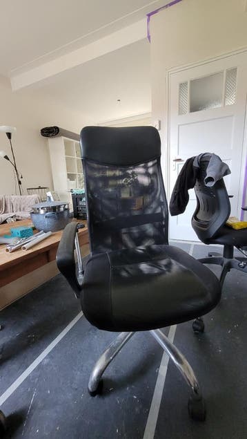 Comfortabele zwarte bureaustoel met een ademende mesh rugleuning en een zitting van stof en kunstleer. De stoel is in hoogte verstelbaar en heeft wieltjes, ideaal voor thuiswerken of op kantoor. De ar