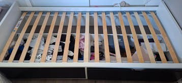 Het frame inclusief lattenbodem en lades is gratis. Er zit geen matras bij.