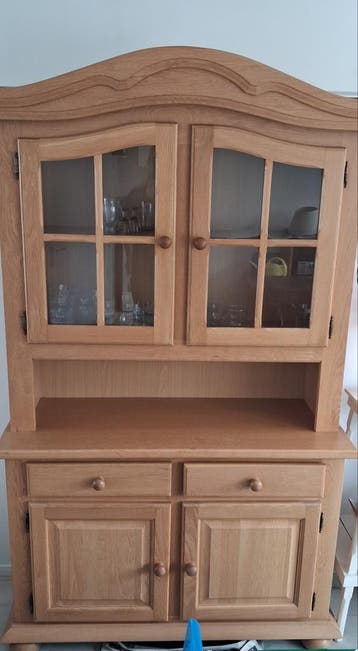 Mooie buffetkast van hout. De kast heeft twee glazen deuren bovenaan, een open vak in het midden en twee lades en twee dichte deuren onderaan. De kast is licht van kleur. Gratis op te halen op vrijdag