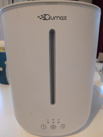 Deze qumax luchtbevochtiger is wit en heeft een waterpeilindicator aan de voorkant. Er zijn knoppen voor een timer, aan/uit en een slaapstand. Het apparaat is gebruikt en heeft wat lichte vlekken aan