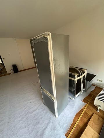 Dit is een inbouw koelkast met een vriesvak onderin. De koelkast is grijs van kleur en heeft een standaard formaat voor inbouw. De achterkant met de koelspiraal is zichtbaar. Gratis af te halen in ams