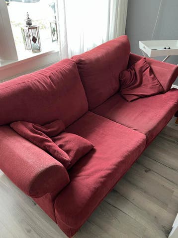 Twee keer rode tweezitsbank. Geen geweldige banken meer. Ze zitten niet super fijn meer maar je kunt er wel lekker in hangen / liggen. Wellicht handig voor in een keet of andere plek waar de jeugd kan