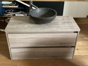 Wegens verbouwing van onze badkamer is dit over. Is in hele goede staat, heeft een stenen wastafel en twee lades. De afmetingen zijn: 100 cm breed 50 cm hoog 46 cm diep mag gratis worden opgehaald. Ma