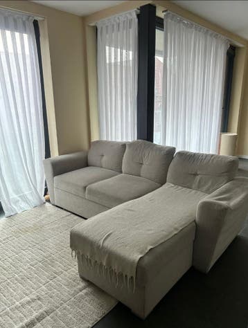 Zo snel mogelijk weg! Gratis ophalen! Mooie moderne hoekbank met chaise longue, in goede staat (lichte gebruikssporen / kleine beschadigingen). De bank zit comfortabel en past perfect in een modern in