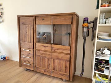 Buffetkast van henders & hazel. De deurtjes zitten een beetje los, maar de kast is zeker nog goed voor een tweede ronde. De kast heeft zowel lades als deuren en glazen planken achter de glazen deu