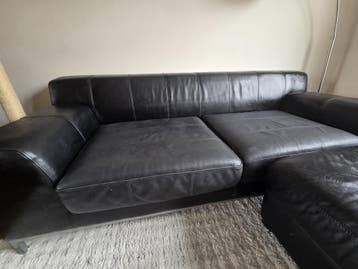 Onze nieuwe bank is vandaag aangekomen dus deze bank staat al buiten. Prachtige bank, met bijhorende poef/hocker. Kan worden opgehaald in amsterdam west, marco polostraat.
