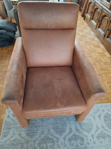 Een bruine kamer stoel met een wat hogere rugleuning. De stoel heeft brede armleuningen en een stevige zitting. Het materiaal lijkt op leer of een soortgelijk stof.