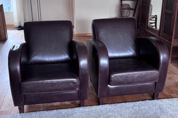 2 bruine leren fauteuils. Kunnen prima gebruikt worden. Geen scheuren wel gebruikssporen.