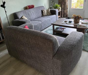 Gratis af halen 2 +3 zitsbank, stof, antraciet grijs. Bank is gebruikt, geen scheuren, stof is hier en daar beetje vervilt. Vulling is nog goed. Ideaal voor gezin met jonge kinderen. Zie foto’s.