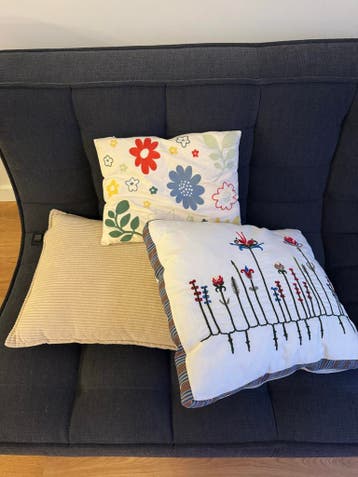 We have three cushions 1. Beige heating pillow (barely used) 2. Embroidered cushion (used, visible frizz) 3. Flower cushion (usrf, a bit if frizz) we are placing these before we bring these to the kri