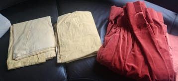 Rood fluweel, drie stuks: ongeveer 80x120cm. Twee gele lappen: ongeveer 100x180cm.
