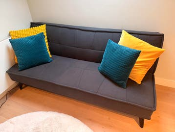Een donkergrijze slaapbank die ook als bank te gebruiken is. De bank heeft een eenvoudig ontwerp en is makkelijk uit te klappen tot een bed. De stof is effen grijs en heeft een lichte textuur. Afmetin