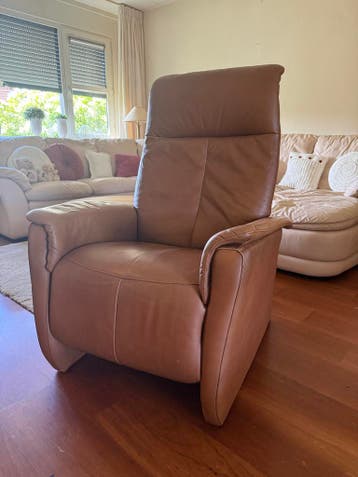 Bruin leren stoel. Verstelbare rugleuning. Met voetensteun. Eigenaar heeft gerookt.