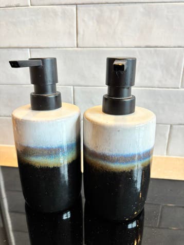 Wie kunnen we hier blij mee maken? 2 Dezelfde zeeppompjes van kwantum. Ze werken nog perfect. Let op: in 1 van de 2 pompjes zit een scheurtjes in het plastic, zie foto. Komen uit een huisdier- en rook