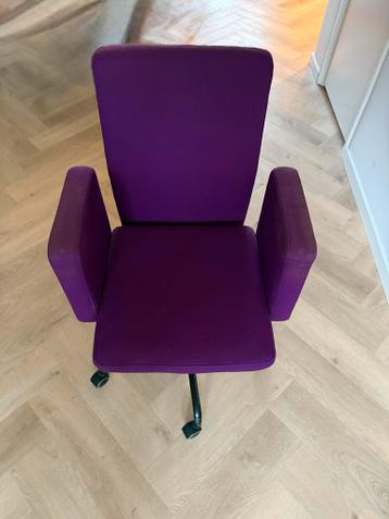 Paarse bureaustoel in gebruikte staat. Verstelbaar in hoogte. Gebruikt, maar kan na schoonmaken nog prima door.