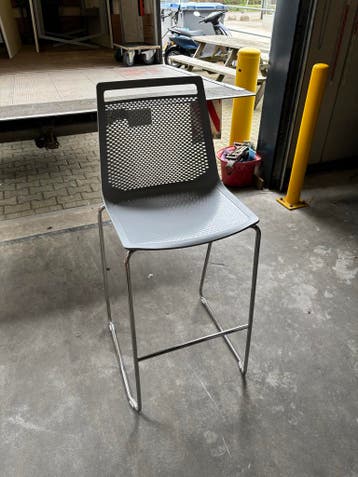 Een gaber akami barkruk. De kruk heeft een grijs kunststof zitvlak en rugleuning met een metalen onderstel. Er zit een voetsteun op.