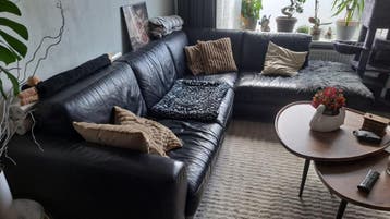 Gratis!!! Zwarte leren hoekbank maten: lengte 280 cm x hoogte 63 cm x breedte 96 cm x diepte 60 cm loungeset: 225 lang de bank heeft aan de zijkant van de leuning beschadiging van de kat en in het mi