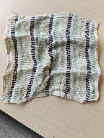 Deze theedoek is gebruikt en heeft een gestreept patroon in blauw, lichtblauw en beige. Ideaal voor dagelijks gebruik in de keuken. Let op: de theedoek heeft enkele kleine beschadigingen, zoals te zie