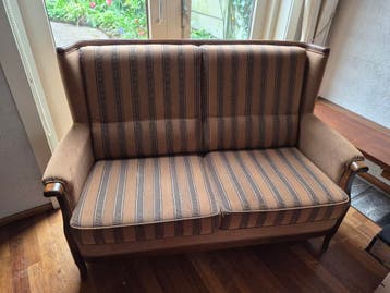 Een tweepersoons bankje met een bruine stof en een streepjespatroon. De armleuningen zijn van hout. Het bankje heeft een hoge rugleuning.