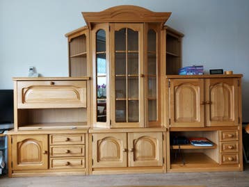 Mooie en ruime 3-delige wandkast, ideaal voor de woonkamer of eetkamer. De kast verkeert in zeer goede staat en biedt veel opbergruimte met zowel open vakken als gesloten deuren en lades. Een perfecte