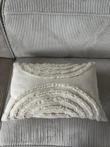 Dit is een crèmekleurig/ gebroken wit kussen met een patroon van bogen. Het kussen is rechthoekig van vorm en in zeer goede staat.