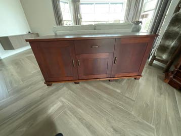 Dit is een houten dressoir. Het heeft drie deuren en een lade in het midden. Achter de deuren zitten planken. De kleur is kersen.