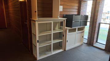 Twee kasten die zowel samen als los van elkaar gebruikt kunnen worden. De ene kast heeft glazen schuifdeuren en de andere heeft dichte schuifdeuren. Ze staan momenteel in de berging en moeten zo snel