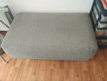 Groot model voetenbank, duidelijk gebruikt, maar met nieuwe hoes of plaid erop prima bruikbaar, is nog wel heel stevig, is puur de bekleding die niet meer zo netjes is.