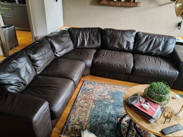 Gratis donker bruine leren hoekbank . Maten 245cm x278cm en diep 92cm. De kussens zitten allemaal los en rondom volledig leer. Zit een slijtage plek in de hoek van de bank zie laatste foto. Verder gee