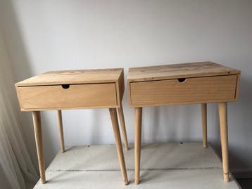 Twee houten nachtkastjes met elk een lade. Ze hebben watervlekken op de bovenkant en de poten zijn wat beschadigd. Ze kunnen een opknapbeurt gebruiken. Hoogte 54 cm, breedte 45 cm, 32 cm diep.