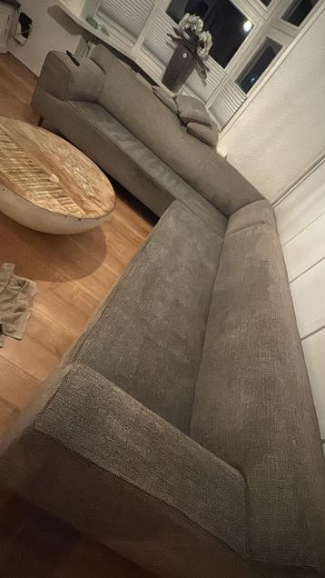 Een design on stock bank. De bank is een hoekbank en heeft een stoffen bekleding. De kleur is bruin gemêleerd. Heeft een reinigingsbeurt nodig. Niet doorgezakt. Zsm ophalen