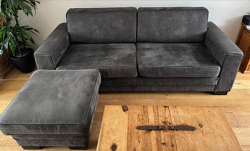 Mooie antraciete 3-zits bank, ideaal voor een comfortabele zit in elke woonkamer. De bank komt met een bijpassende hocker, perfect om je benen op te leggen of als extra zitplaats. De afmetingen van de