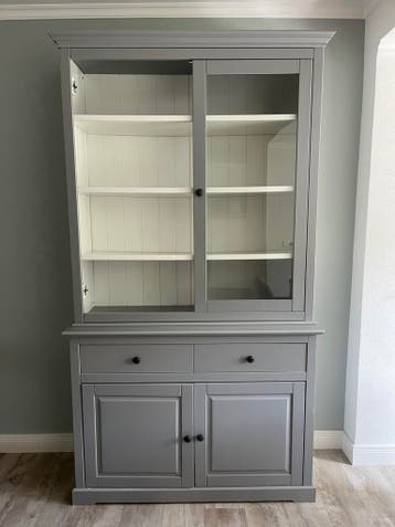 Grijze buffetkast. In twee delen te vervoeren. Veel bergruimte. Opknapper. Er mist een deur en de planken hangen door. Verf is er op sommige plekken af. Gratis af te halen. Breedte is 121cm diepte ond