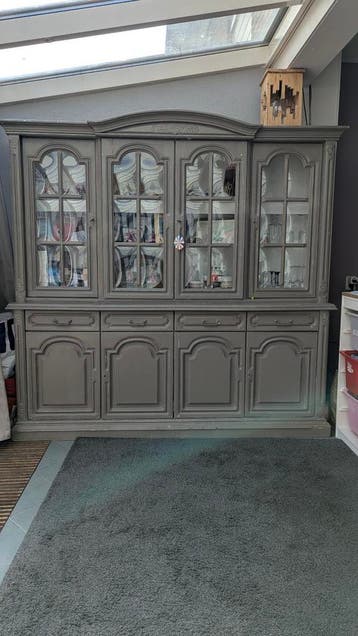 Deze buffetkast is grijs geverfd en heeft vier glazen deuren bovenaan en vier dichte deuren onderaan. Er zijn ook vier lades aanwezig. De kast heeft een klassieke uitstraling.