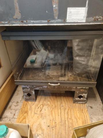 Mooie inbouwhaard houtkachel met liftdeur en 3-zijdig glas. Geeft een prachtig zicht op het vuur. Geschikt voor de verwarming van