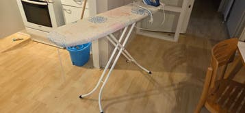Een strijkplank met een blauw strijkijzer erop. De hoes van de strijkplank heeft een bloemenpatroon in roze en blauw. Het strijkijzer heeft een snoer.