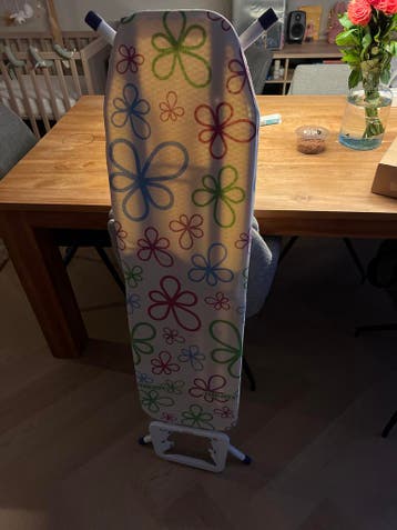 Een leifheit strijkplank met een hoes met bloemenpatroon. De strijkplank is inklapbaar en heeft een wit frame. Het model is fashion s, geproduceerd in mei 2014.