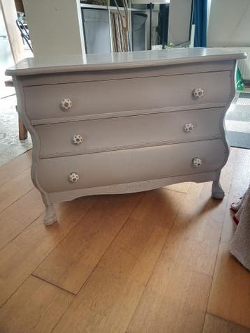 Brocante buikkastje, is al geschilderd en met andere knopjes op de lades. Mag hier weg ivm ruimtegebrek. Het is ee beetje een opknapper, de bodemplaten van de lades zijn niet goed verlijmd. Schuift af