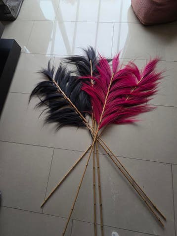 Gratis af te halen: gave grote pluimen - veren op bamboestok. Ongeveer 1.80Mtr lang 2 roze en 4 zwarte alleen ophalen! Worden niet verstuurd.