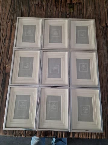 9 fotolijstjes aan elkaar gemaakt met nietjes met per lijstje 3 paspartoe's kleine beschadiging zie foto's kleur van de lijstjes is zilver