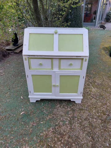Mooi elegant degelijk houten bureautje/secretaire met klepdeksel. Intensief gebruikt dus verfwerk is vies en beschadigd. Maar verder is het een stevig bureau waarvan alle onderdelen goed werken en nie