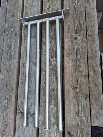 Dit is een handdoekenrek met vier stangen. Het rek is gemaakt van metaal en kan aan de muur worden bevestigd. Het is geschikt om handdoeken op te hangen in de badkamer of keuken.