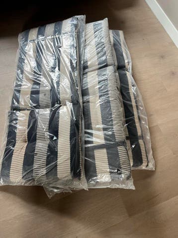 Drie kussens met een zwart-wit gestreept patroon. Ze zitten nog in de plastic verpakking. De kussens zijn rechthoekig van vorm.