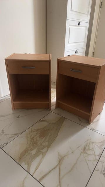 Twee gratis nachtkastjes, ideaal voor naast het bed. Ze hebben een lade en een open vak voor extra opbergruimte. Ze zijn gebruikt, maar nog in prima staat. Ophalen in lelystad in de landerijen.