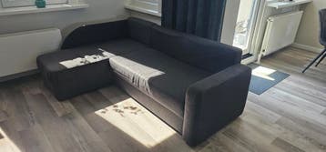 Donkergrijze hoekbank met een lengte van 200 cm en een diepte van 140 cm. De bank heeft een chaise longue aan de linkerkant en biedt opbergruimte onder het zitgedeelte. Voor transport kan de bank in t