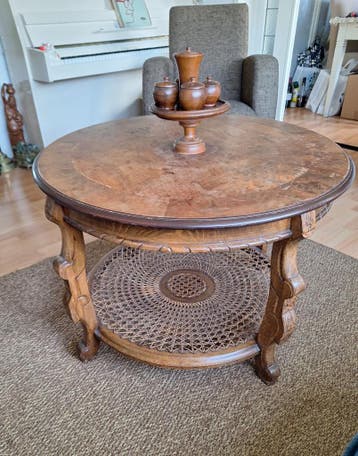 Bekijk ook de andere advertentie (gratis secretaire). Salontafel / bijzettafel, in nette staat. Het vlechtwerk aan de onderzijde is ook in goede staat. Het blad is 83 cm in doorsnede en de tafelhoogte