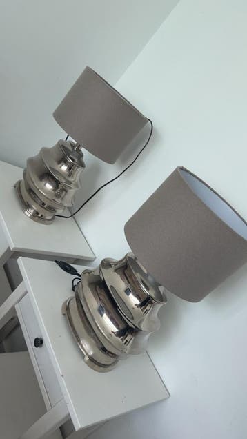 Twee nachtlampjes van zara home met een zilverkleurige voet en grijze kap. Er zitten twee witte ikea nachtkastjes bij, deze zijn gratis. Ivm verhuizing gaan ze weg gekocht voor 80€ per stuk zien