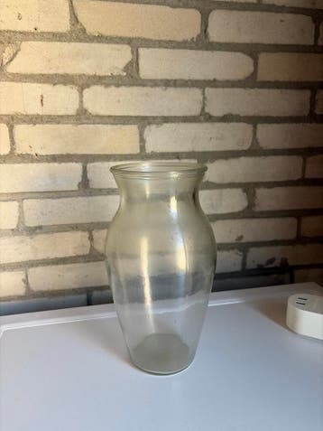 Een glazen vaas. De vaas is doorzichtig en heeft een brede opening aan de bovenkant. Er zit wat stof aan de binnenkant, maar verder is hij nog goed.