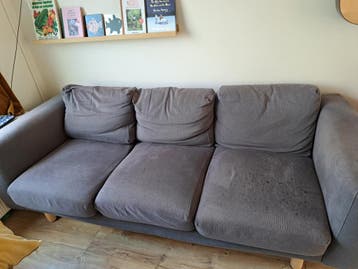 Een driezits bank met stoffen bekleding. De bank is grijs van kleur en heeft drie losse zitkussens en drie rugkussens. De poten zijn van hout. De kussenslopen zijn los te ritsen. Heeft gebruikersspore