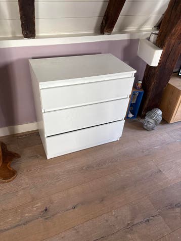 Gratis af te halen. Praktisch wit ladekastje met drie ruime lades, ideaal voor het opbergen van kleding, documenten of andere spullen. Het kastje is gebruikt, maar in goede staat en past in vrijwel el